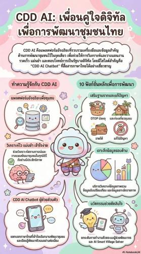 CDD AI คือ เว็บไซต์และแพลตฟอร์มผู้ช่วยพัฒนากรที่ใช้เทคโนโลยีปัญญาประดิษฐ์ (AI) รวบรวมข้อมูล เครื่องมือ และสารสนเทศสำคัญด้านการพัฒนาชุมชนไว้ในที่เดียว ช่วยให้พัฒนากร ผู้บริหาร และประชาชนเข้าถึงข้อมูลที่จำเป็นได้ง่ายขึ้น พร้อมสามารถวิเคราะห์สถานการณ์ชุมชน วางแผนการพัฒนาได้อย่างรวดเร็ว แม่นยำ และมีประสิทธิภาพ